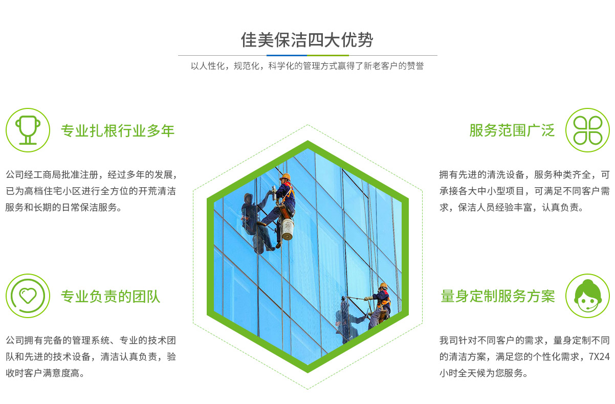 - 馬鞍山市佳美保潔服務有限公司是一家經工商部門批準,具有法人資格專業清洗,馬鞍山保潔服務的公司,自創(chuàng)辦以來,一直致力于企業,家庭,賓館,學校,別墅,酒店,商廈,公共設施等場所提供科學的日常保潔和清潔保護的服務公司,有著豐富的管理服務和保潔經驗...